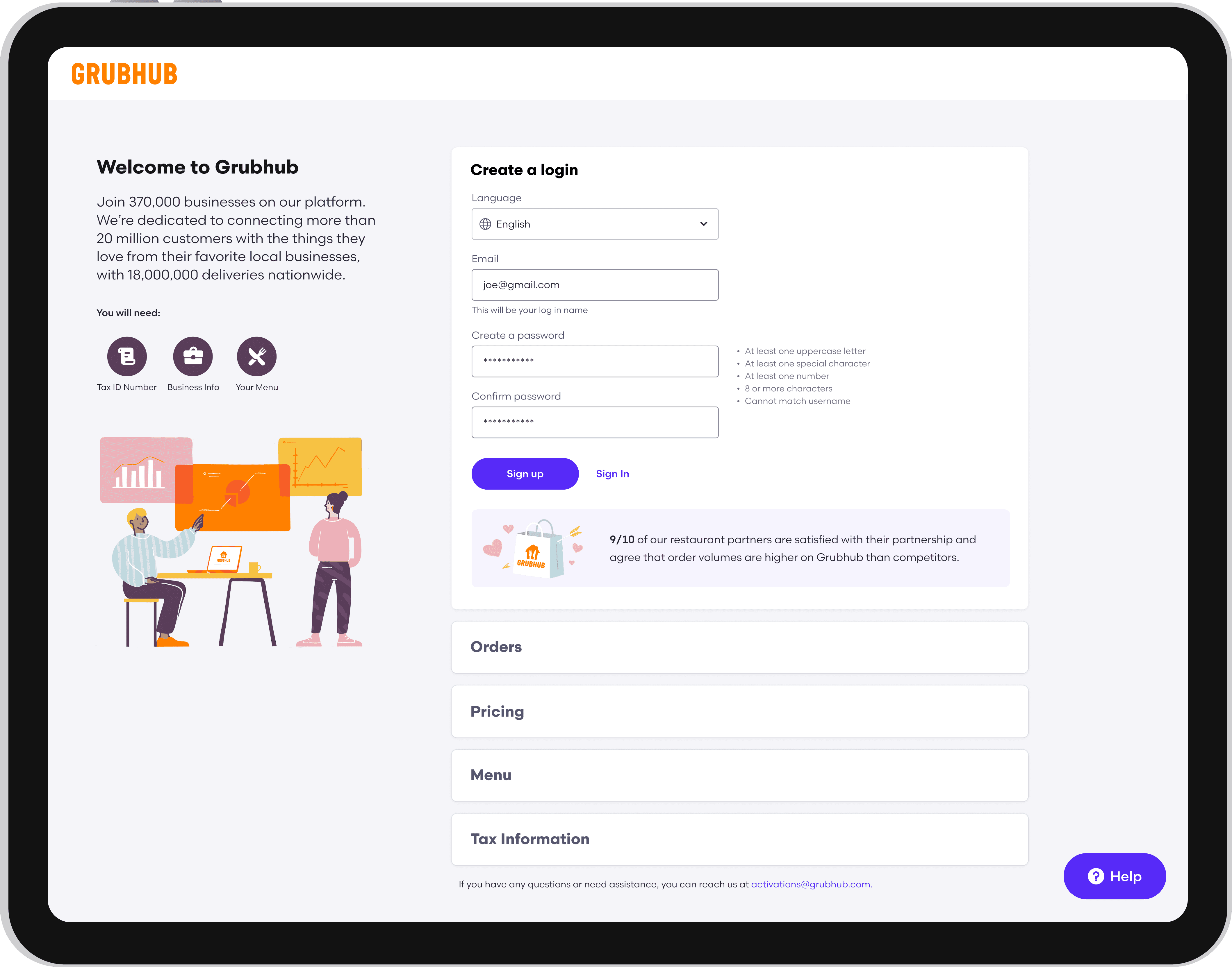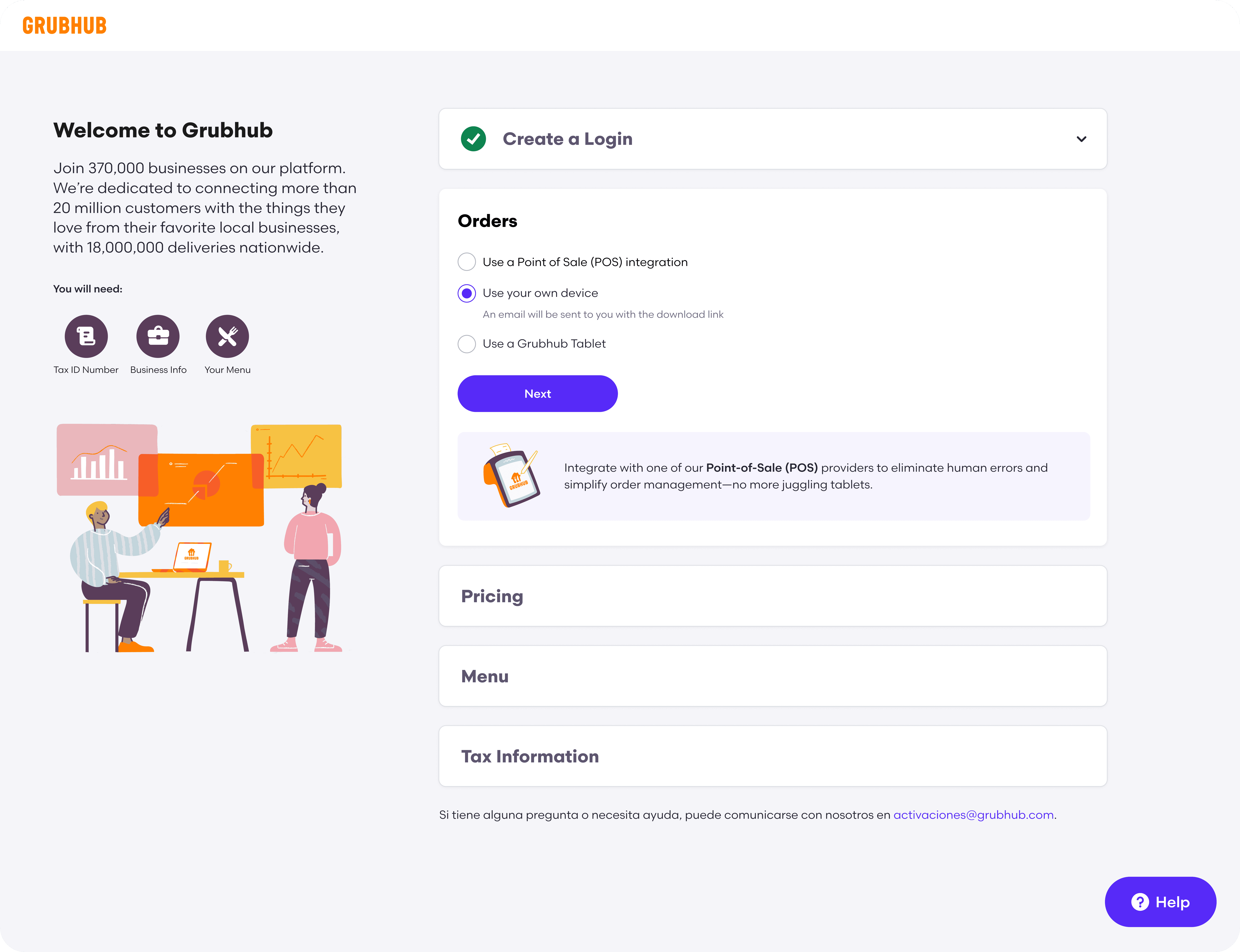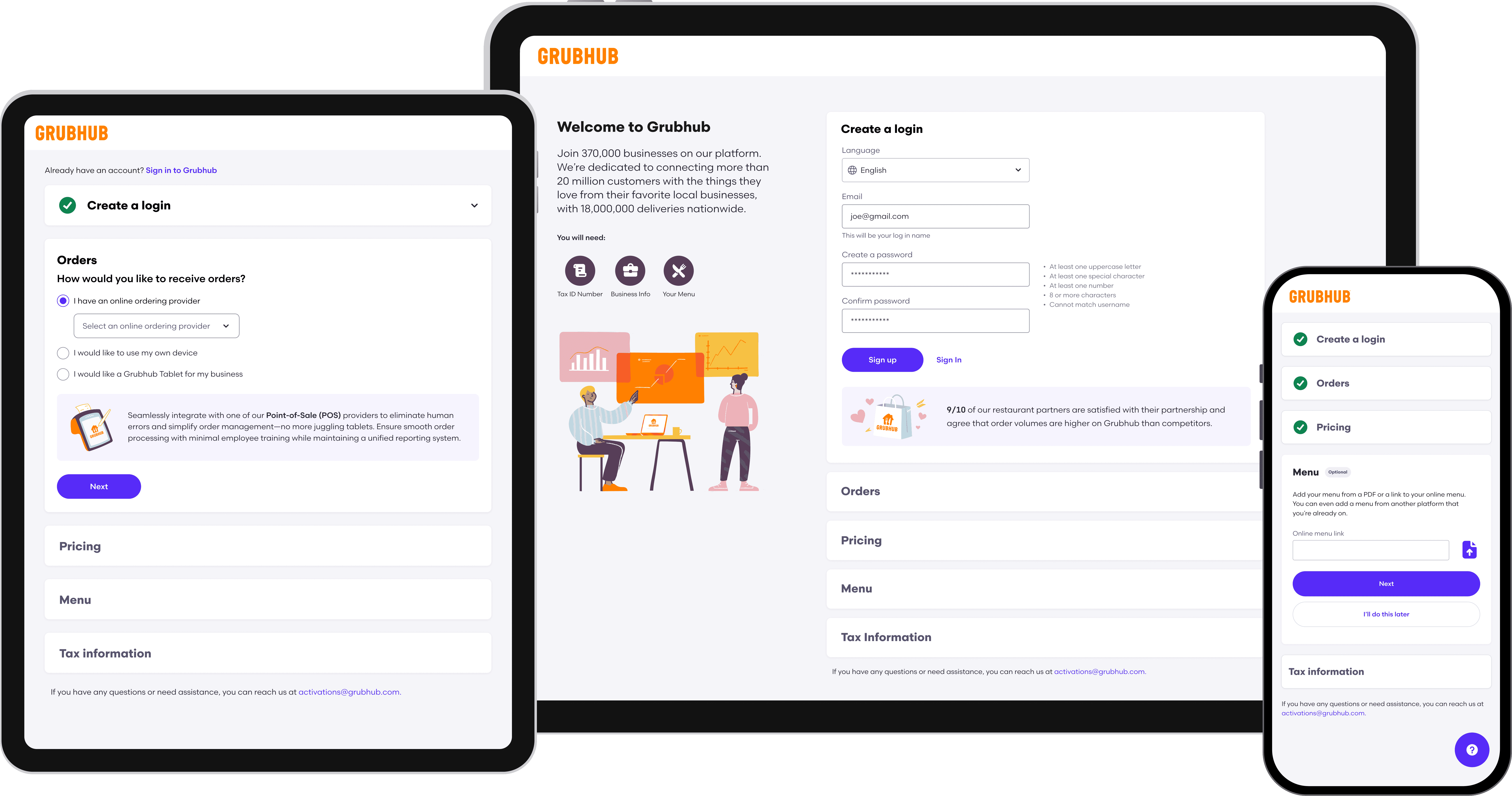 Partnering with product, engineering, copy, and sales, I led the design of an optimized onboarding experience that enabled merchants to onboard to the Grubhub platform independently, without needing a sales representative.