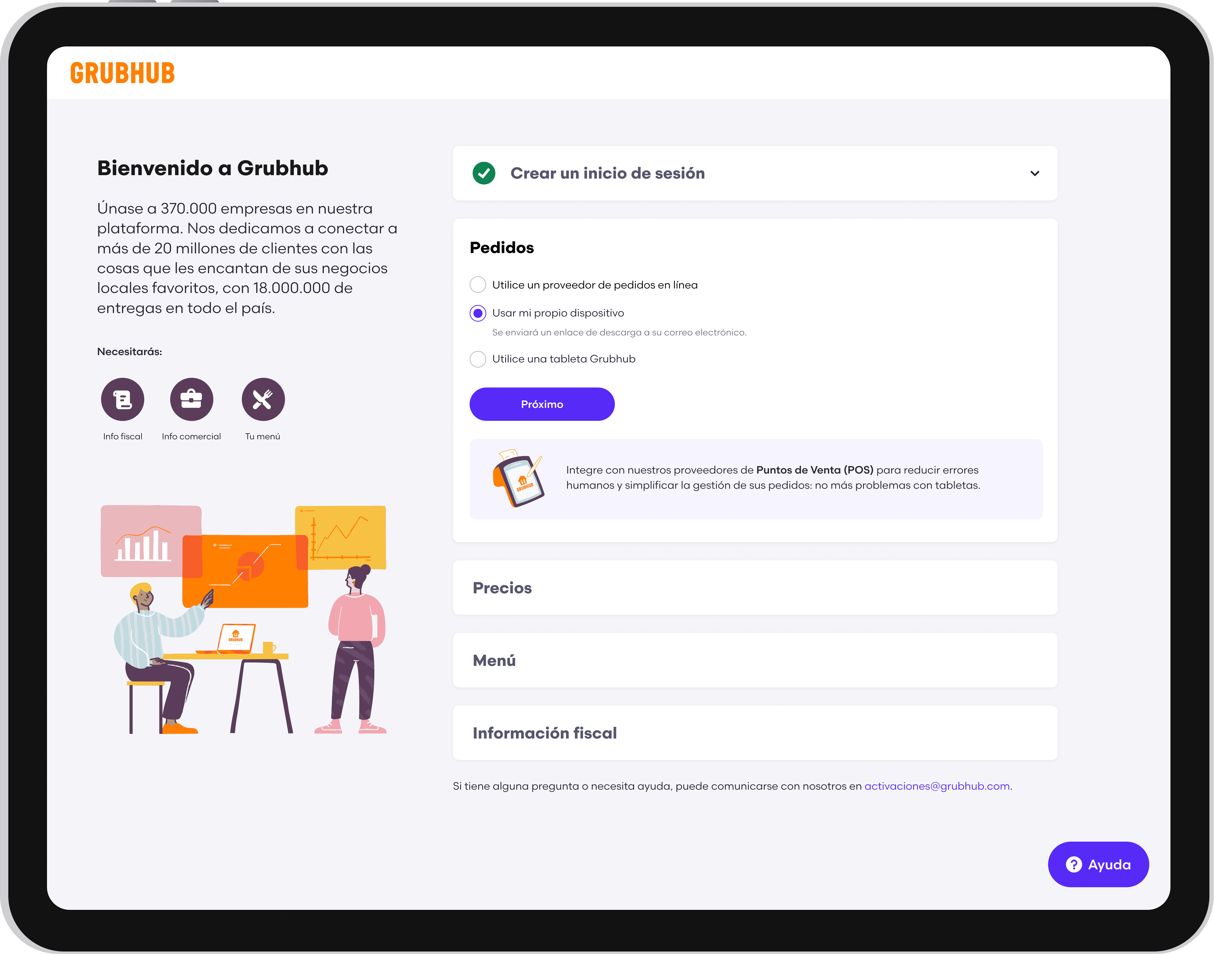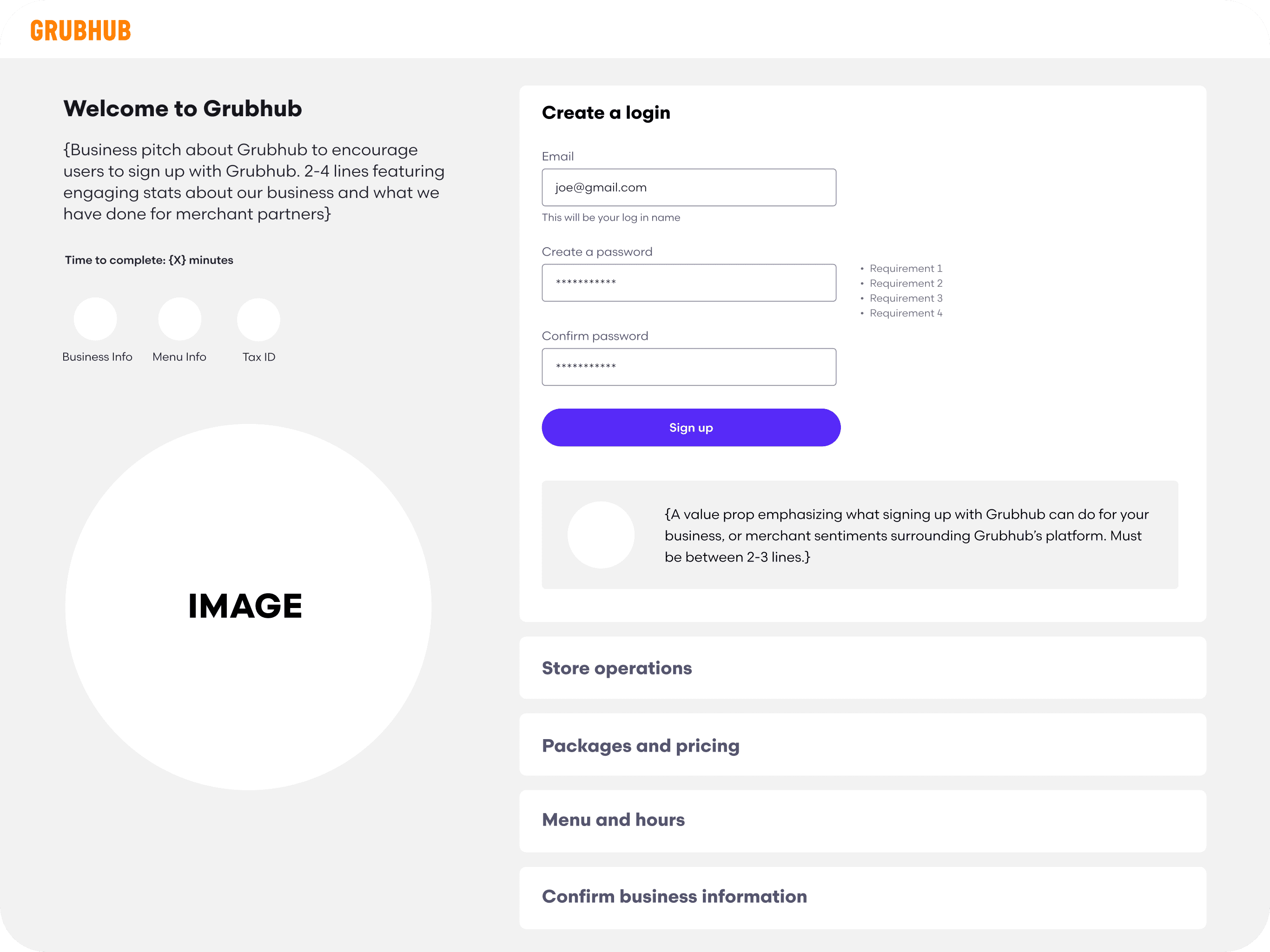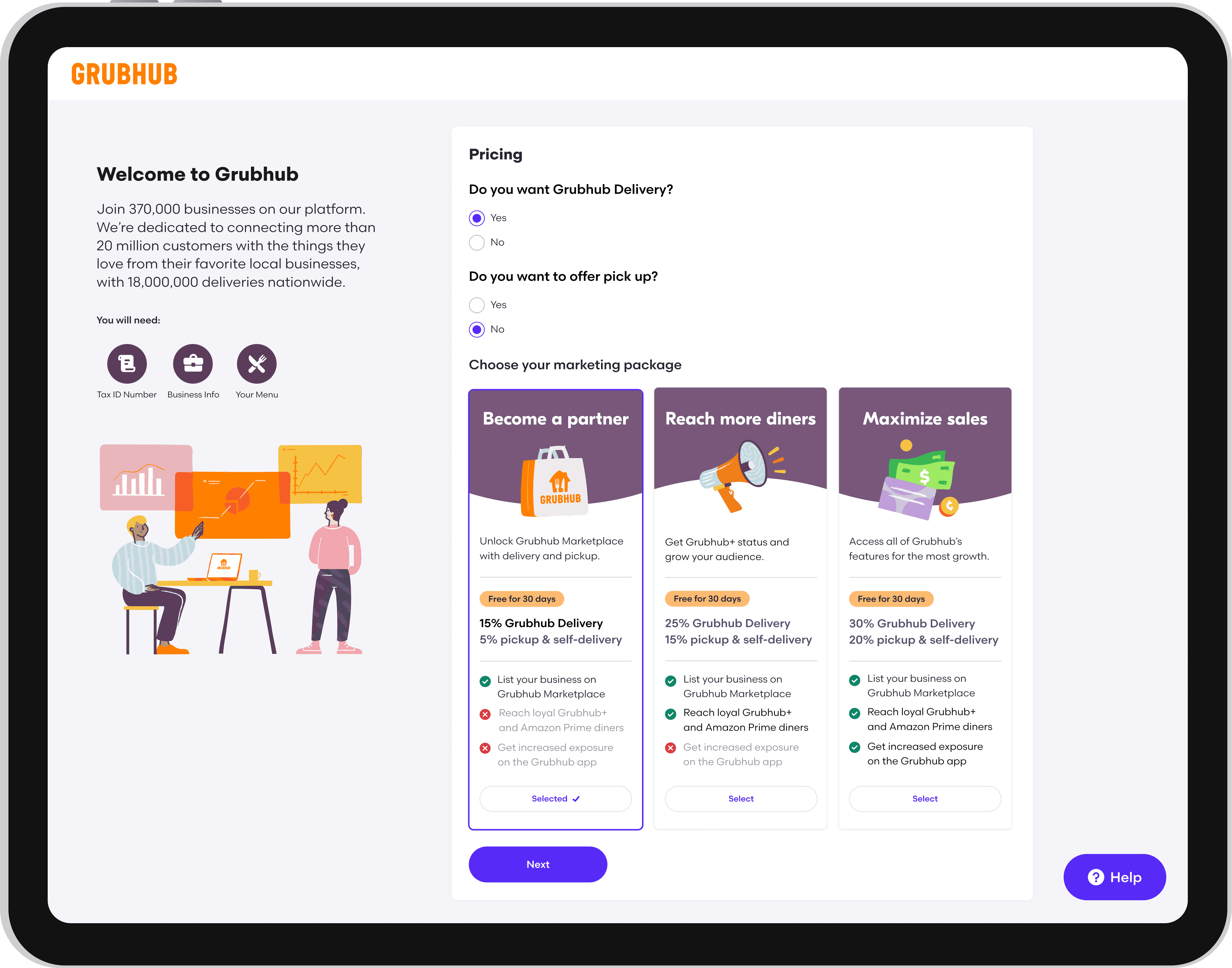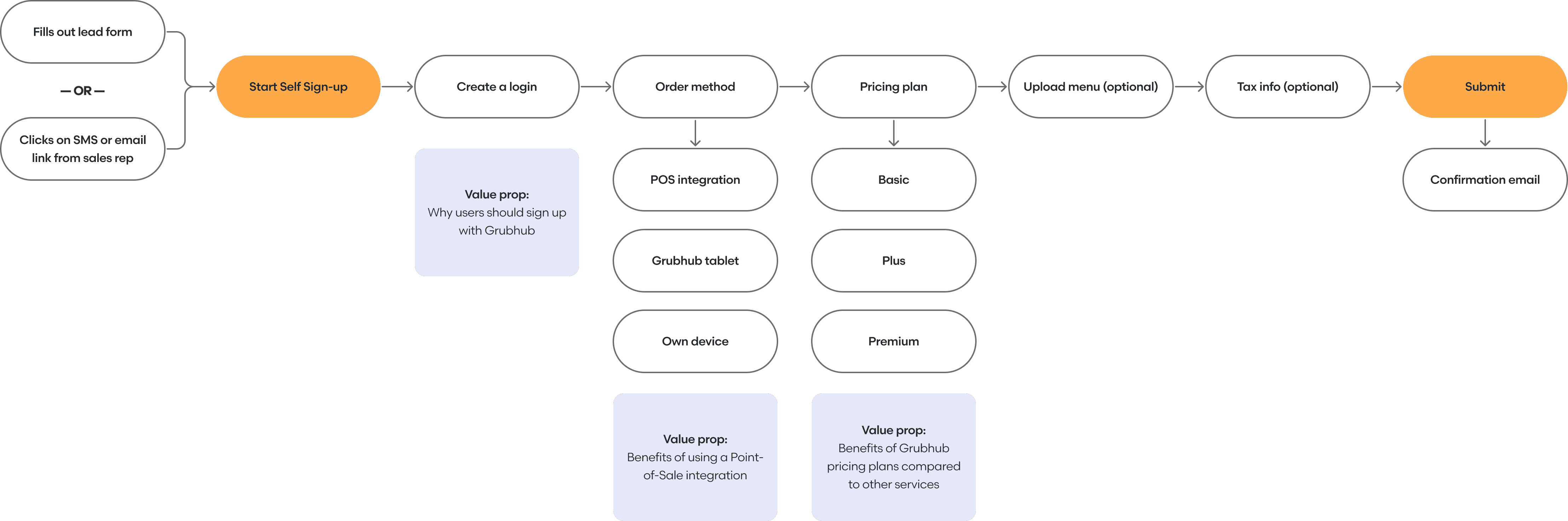 Partnering with product, engineering, copy, and sales, I led the design of an optimized onboarding experience that enabled merchants to onboard to the Grubhub platform independently, without needing a sales representative.