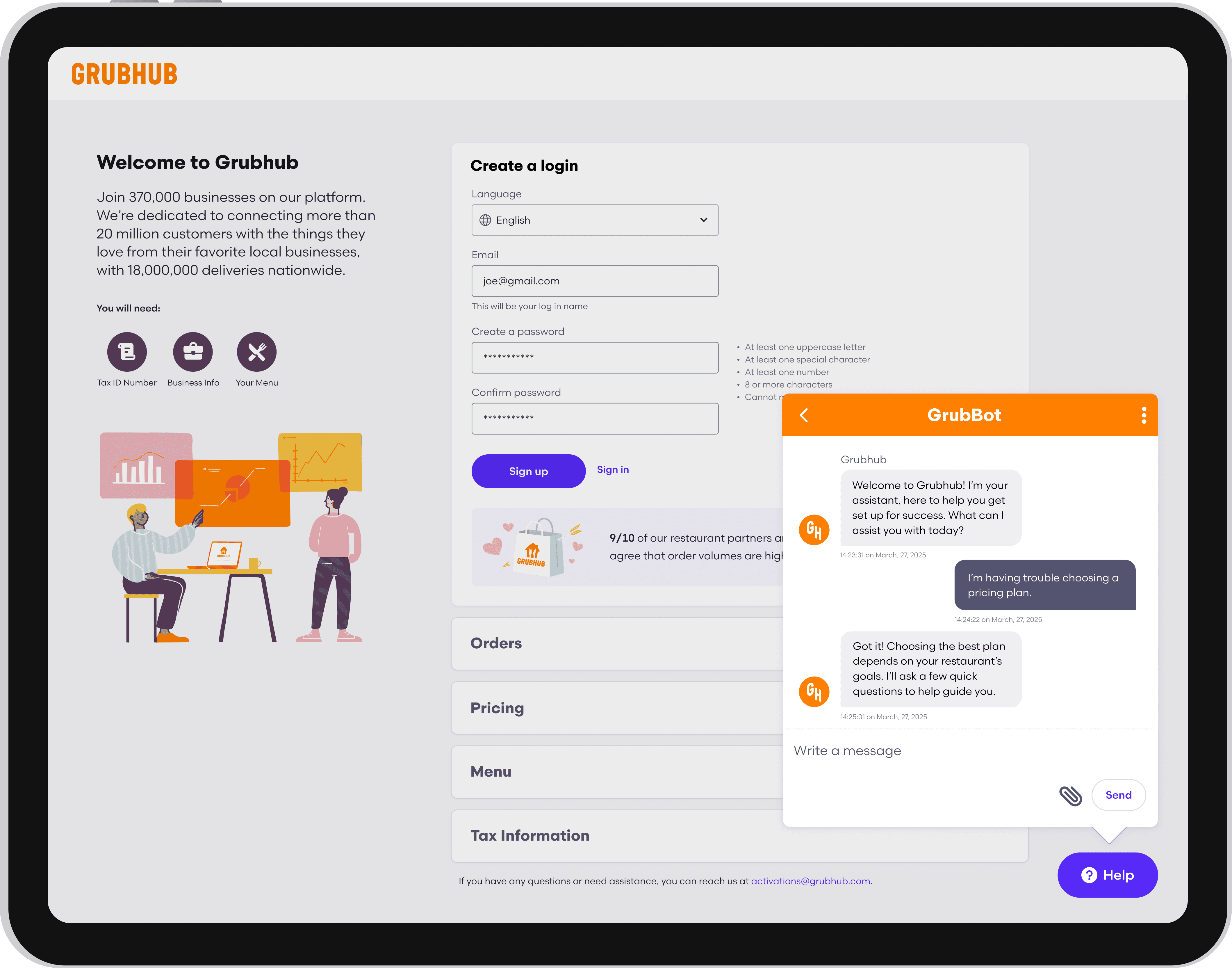 The redesigned onboarding flow improved merchant engagement, completion rates, and conversions while decreasing wait times to go live. GrubBot reduced drop-off through real-time guidance, while language translation, transparent pricing, and responsive design made the experience more inclusive, flexible, and user-friendly.