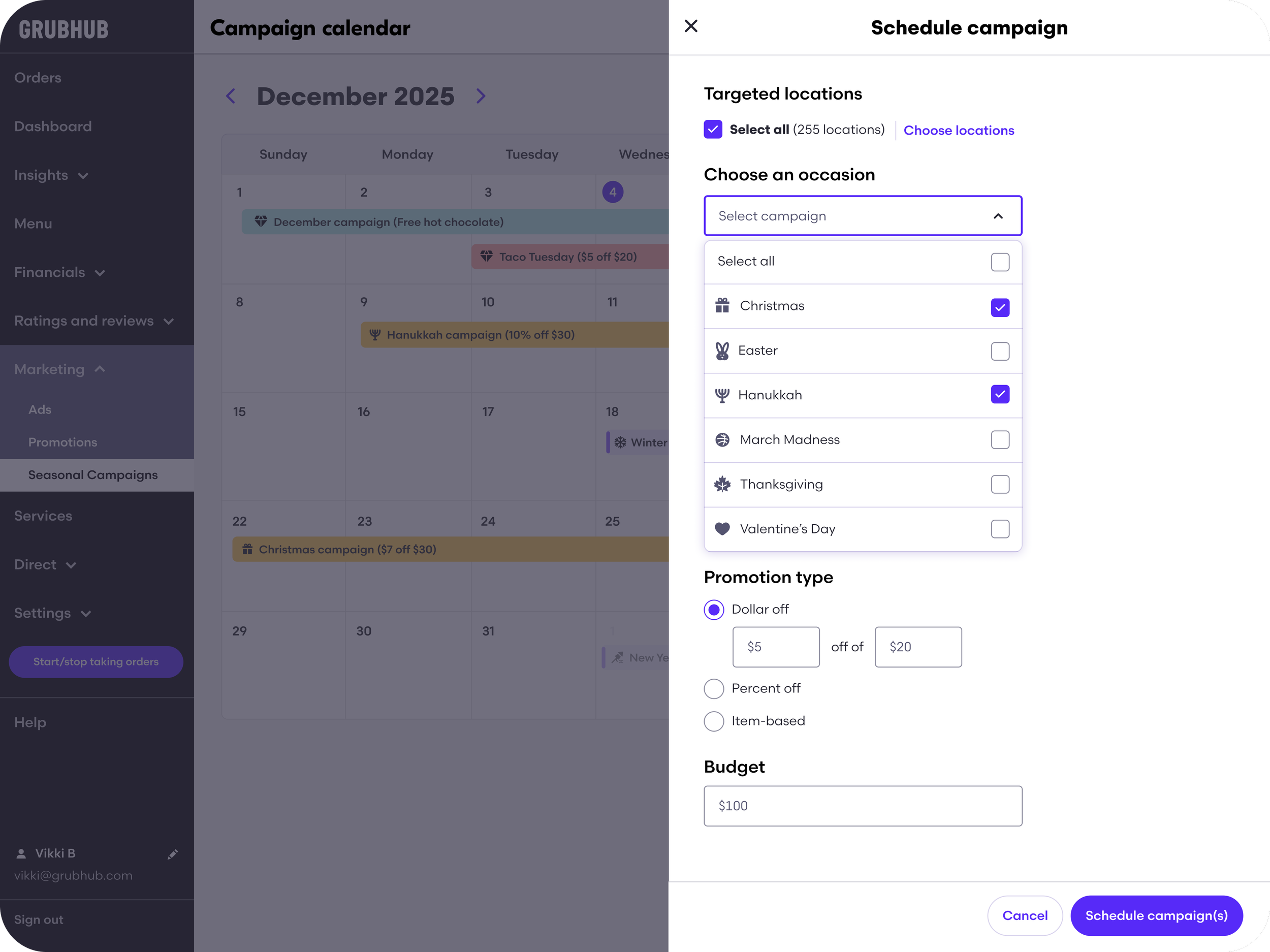 Grubhub offers seasonal campaigns to help restaurants attract more diners during special occasions. These campaigns—such as “$5 off for the Holidays”—are pre-determined offers that restaurant operators can opt into.