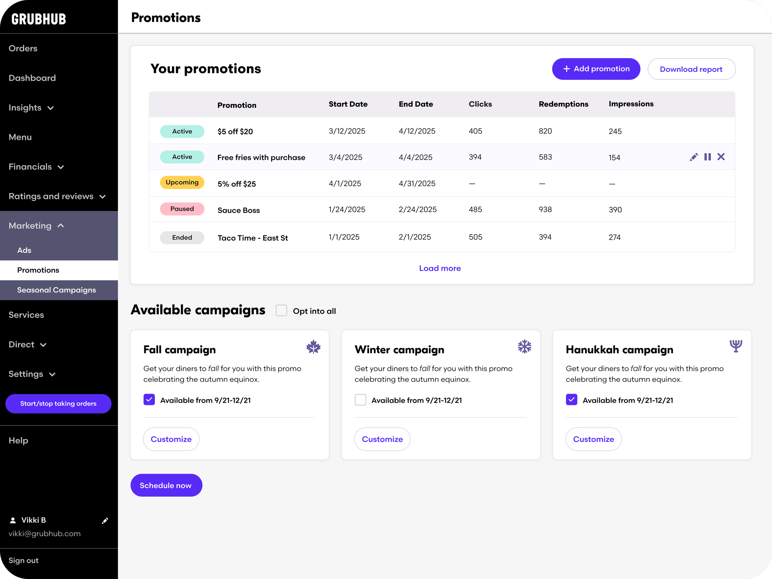 This experience is intuitive, user-friendly, and significantly improves campaign visibility, enabling restaurant operators to better manage promotions. Grubhub stands out from competitors by offering a more customizable approach. Additionally, we added a way to opt into available campaigns from the Promotions Management page to further amplify visibility. Users can quickly opt into some or all of these campaigns and customize them with just a click.