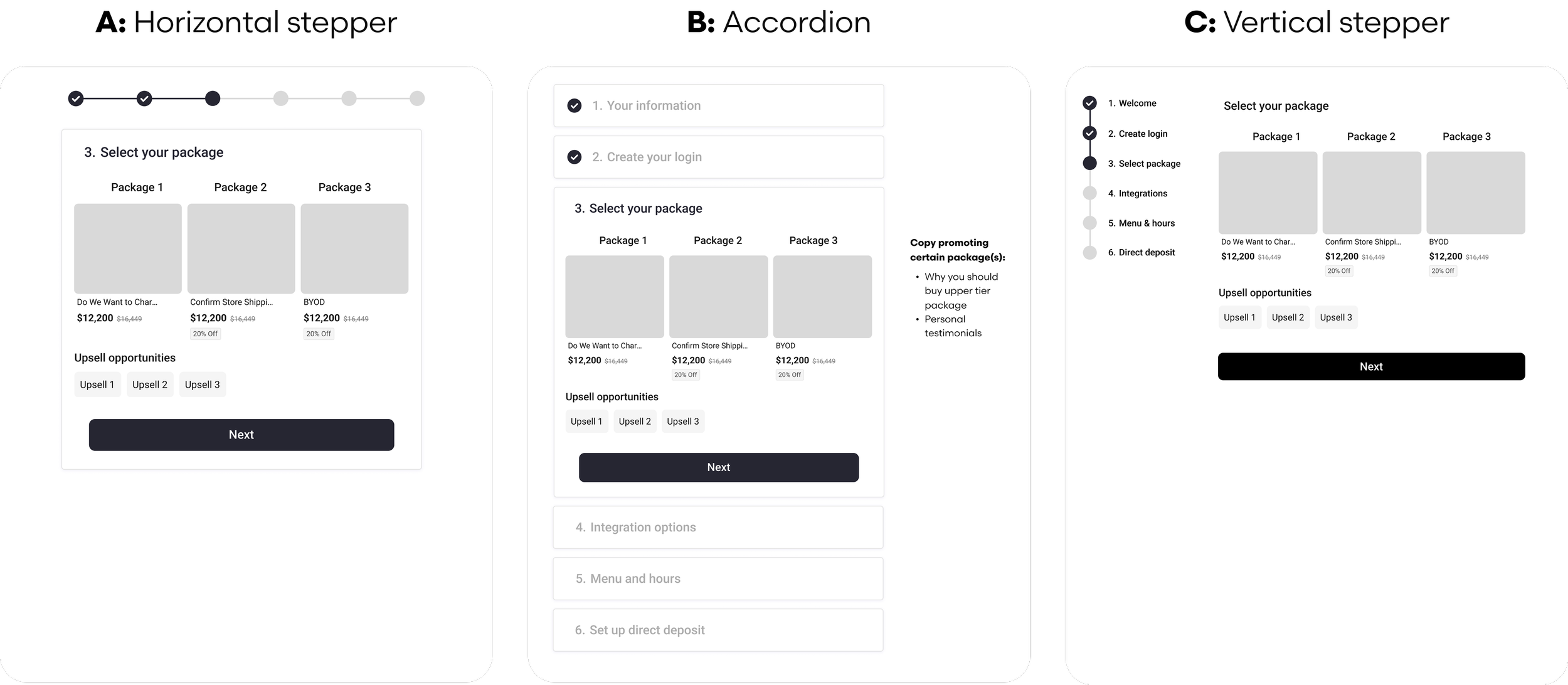 In the wireframing stage, I worked to determine the best way to organize the required information, experimenting with 3 different directions: a horizontal stepper approach, an accordion design, and a vertical stepper. I felt that the accordion design might work best to organize the complex information and allow users to reference previously submitted fields. This is especially important for our busy partners who might have to walk away during the process and want to check on what they submitted so far. I synced with my partners to review each option and conducted user testing to determine the best approach.
